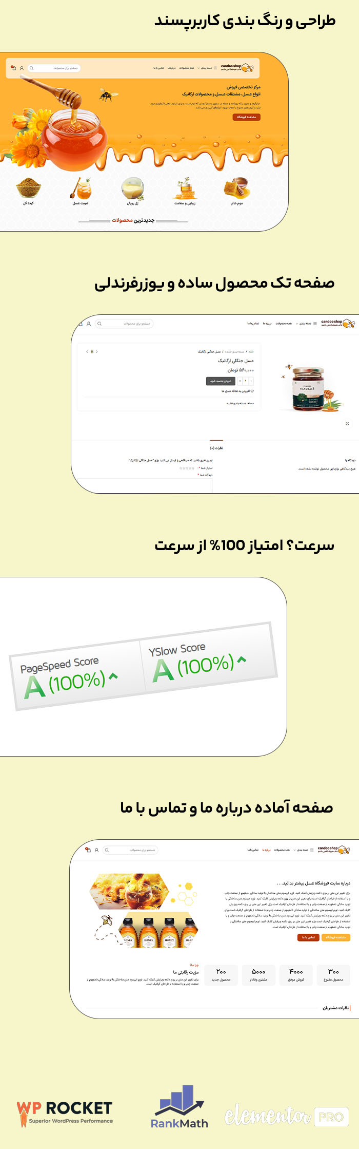برای راه اندازی فروشگاه اینترنتی با موضوع فروش عسل ، پیشنهاد ما استفاده از قالب فروشگاهی عسل است. این قالب فروشگاهی که با فروشگاه ساز ووکامرس سازگاری کامل دارد یک گزینه ایده ال برای راه اندازی وب سایت شما می باشد. این قالب به صورت بسته آسان نصب ارائه شده است که شما را از هر گونه سختی مراحل نصب و خطا رها می سازد. فایل های موجود در این بسته کامل فروشگاهی شامل افزونه سئو رنک مث سئو PRO – افزونه افزایش سرعت WP Rocket – صفحه ساز المنتور پرو – افزونه ورود و عضویت با شماره موبایل Digits و همچنین سازگاری کامل با موبایل و تبلت است.